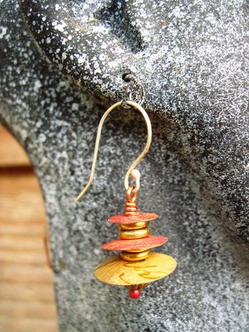 Recycled tin Asian inspired dangle earring with brass and copper
