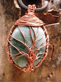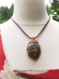 An aventurine cabochon has been wire wrapped with copper wire to make this tree of life pendant. The tree of life is a spiritual symbol in many cultures as the roots reflect the branches so "as above so below," or "on earth as it is in heaven."