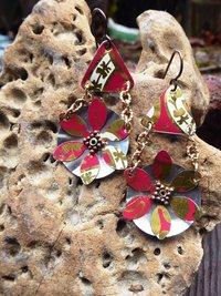 These big and bold one of a kind earrings are perfect for the wild and free spirit. The earrings are light as they are made from a recycled holiday tin. The multicolored daisy pattern is cold connected to a silver background which is also tin. A recycled brass plate chain from the thrift store connects the flower section to a triangular component. The length from the top of the earwire to the bottom of the daisy piece is two and a half inches . The width of the earring is on inch at the widest part