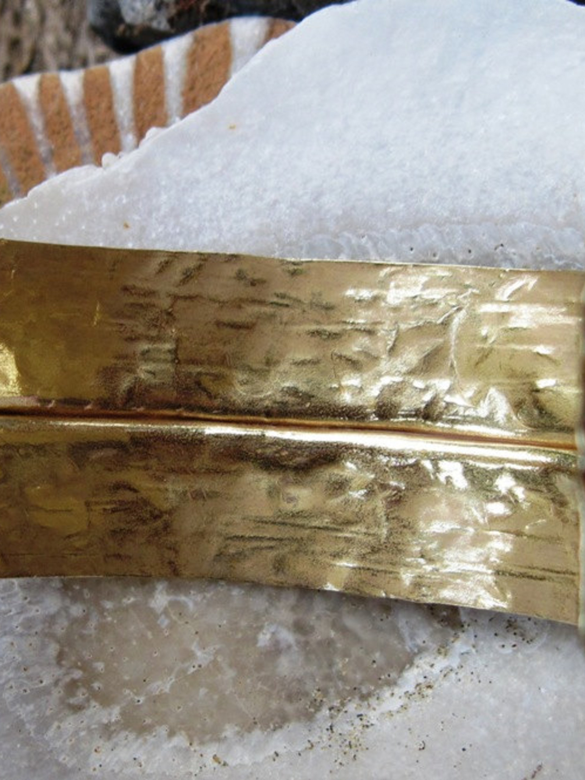 Jewelers bronze has been heated forged and hammered to make this tribal foldform bracelet. Bracelet has a fold down the middle and one side has a lined hammer pattern the other a more diamond like pattern. Bracelet has a very rustic organic feel to it.