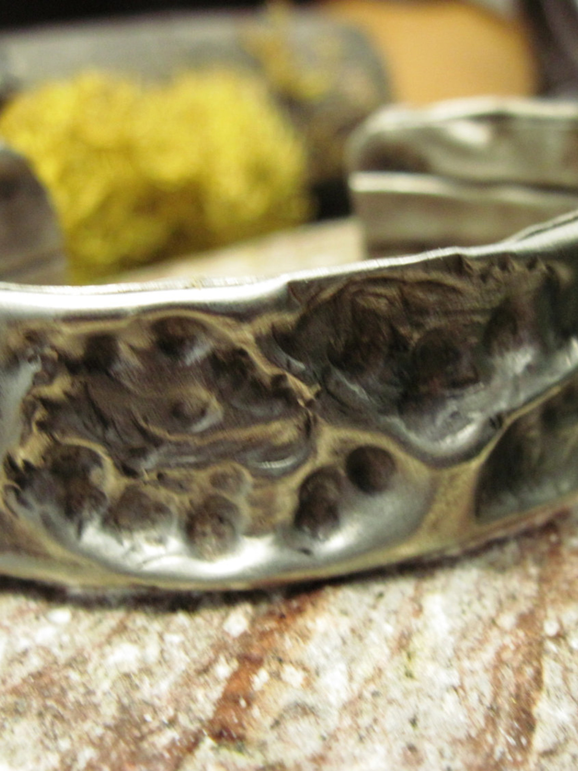 Air chased fold form cuff of German silver is perfect for either gender. The cuff is a piece of forged jewelry and requires repeated heating and hammering. The cuff is three quarters of an inch in width and the inside diameter of the cuff is 6 inches so it is appropriate for a wrist up to about 7 and a half inches.