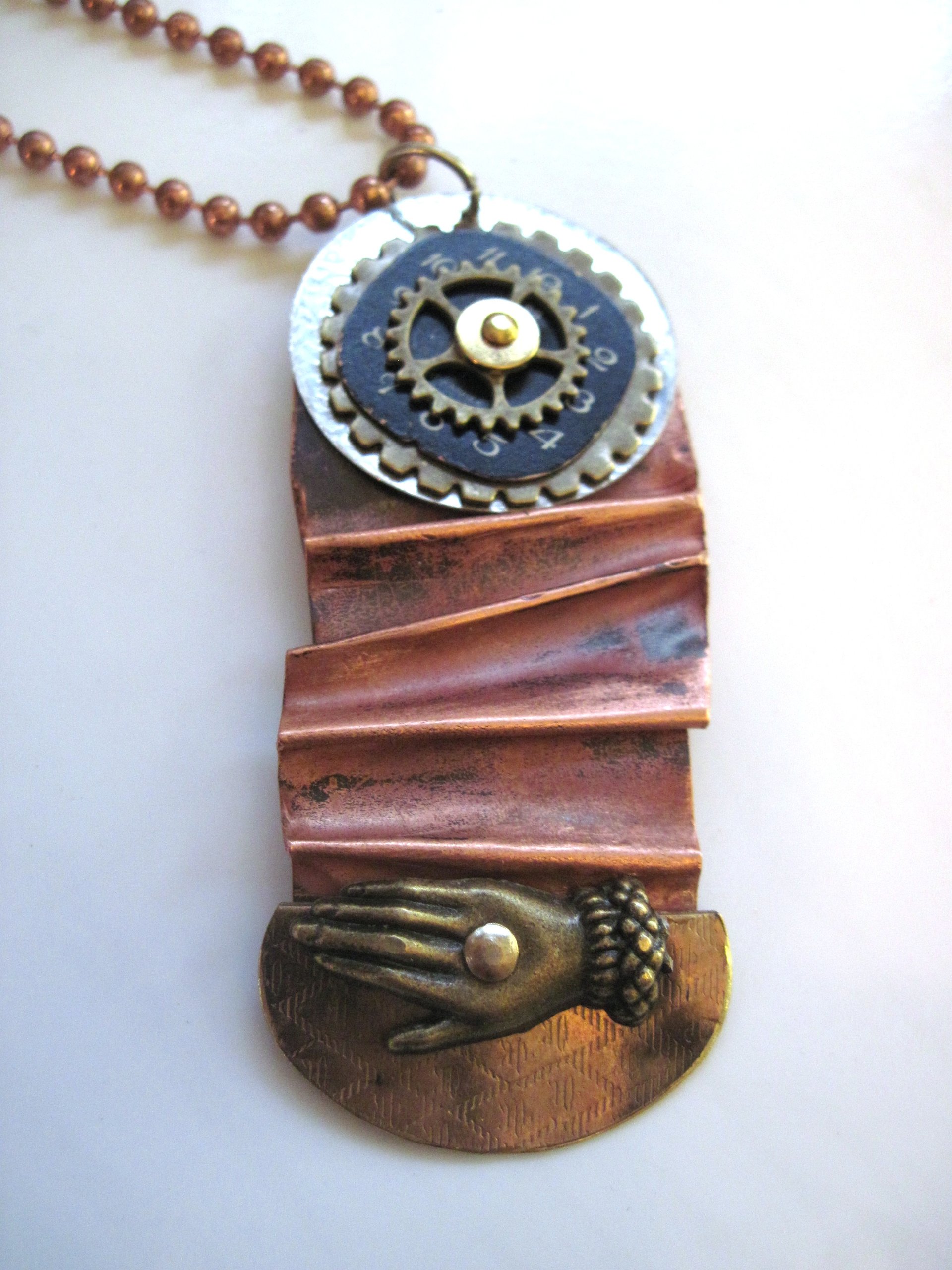 Hand of Time is a steampunk pendant with gears, a clock face and a hand charm. The components are cold connected together and the piece is both fun and funky. This is another of my one of a kind signature pieces.