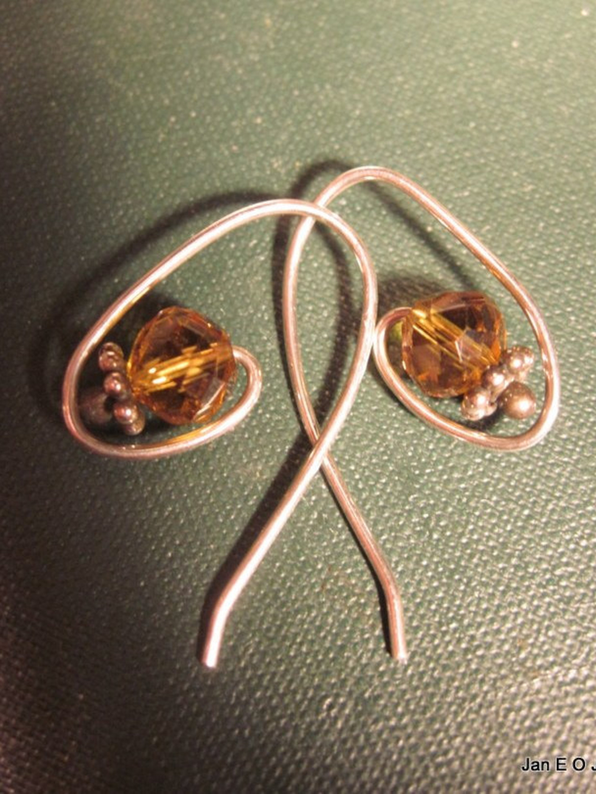 These multifaceted golden crystals earrings have a hoop look without being a true hoop earring. The wire goes through the ear lobe and the crystal drop hangs just below the ear. Picture three shows how it would look if you imagine the hole in the card as an ear lobe.