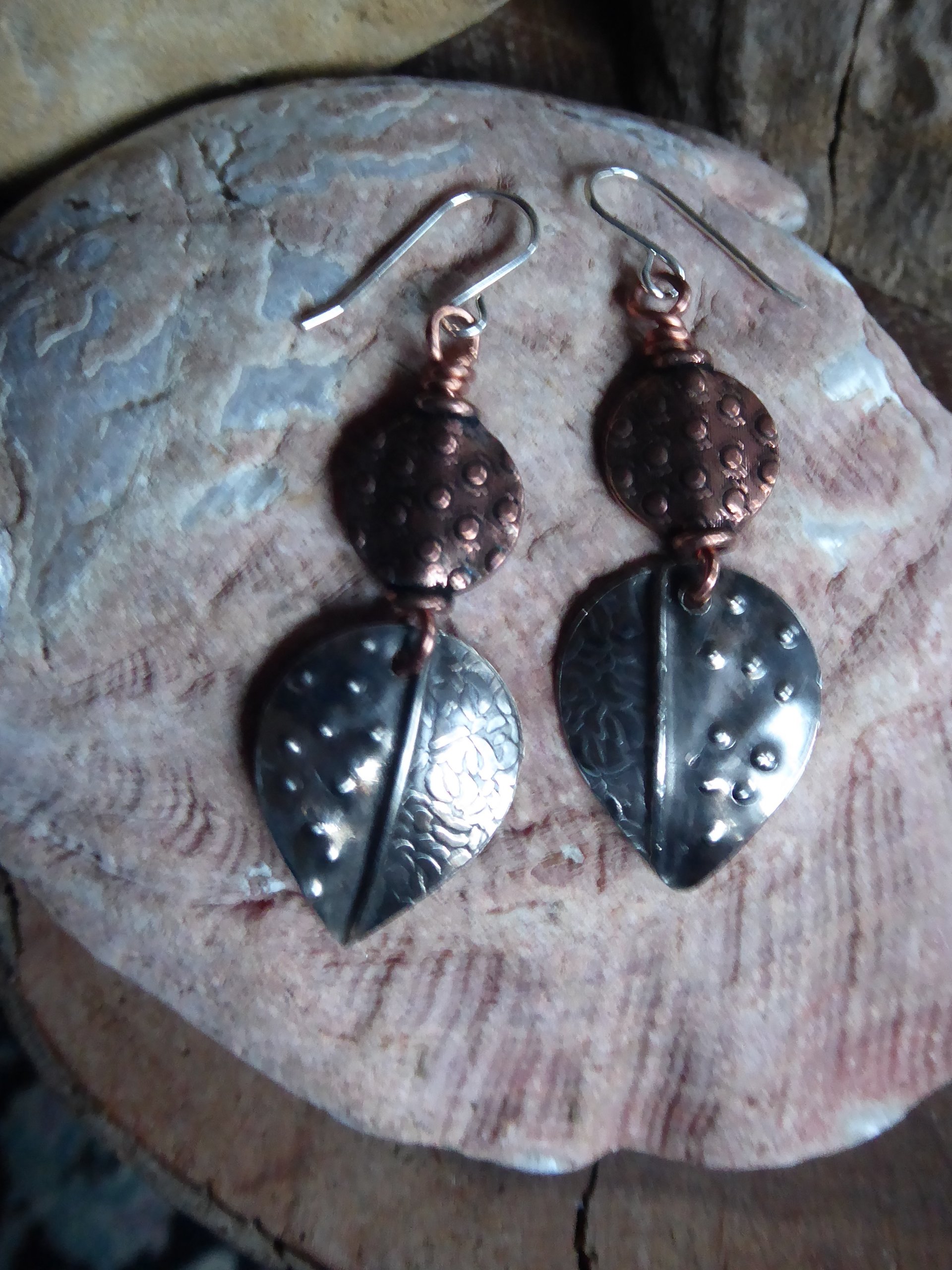 German silver has been textured, heated and folded to make the "leaf" portion of these dangle earrings. The top component is a copper bead and the two components are connected with a copper wire. The ear wire is sterling silver