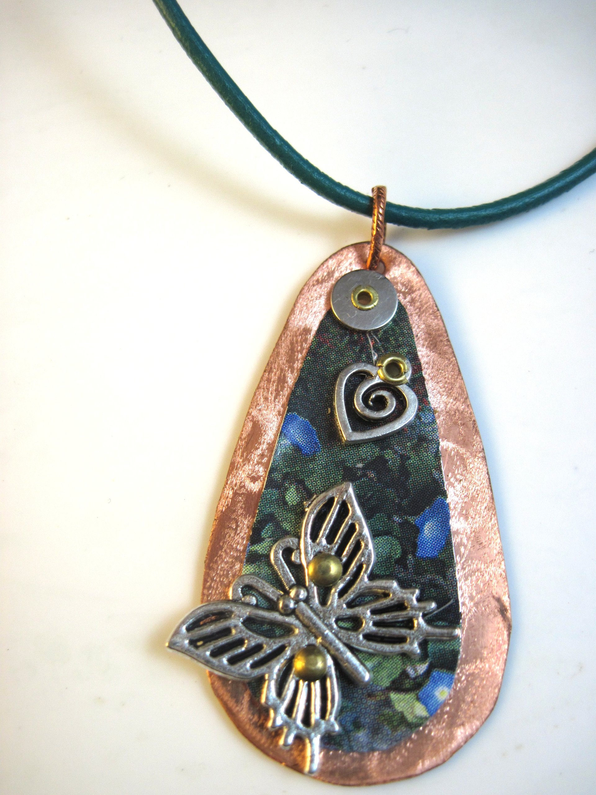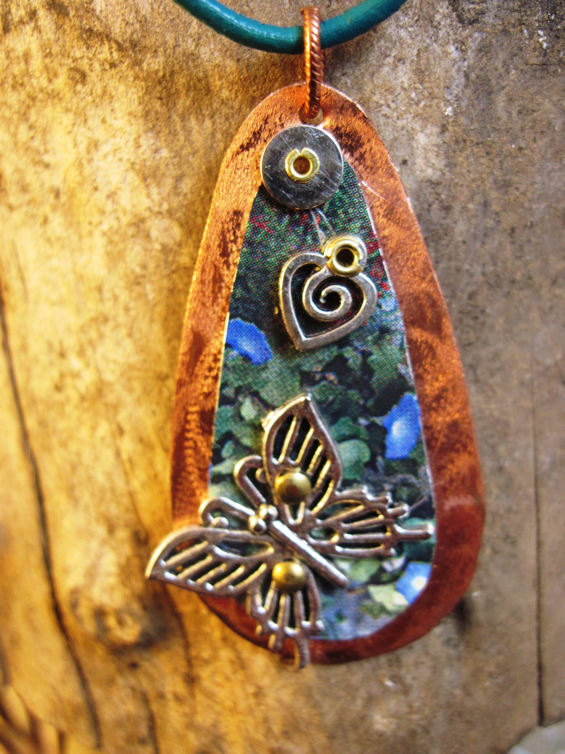 Recycled cookie tin has been cut and cold connected to a tear drop shape copper piece to make this sweet Trashy Tinsel pendant. A base metal butterfly charm as well as a small heart have also been cold connected to the pendant. The tin is a dark green with light blue flowers so it looks like the butterfly is out in a garden. The copper disc is slightly textured.