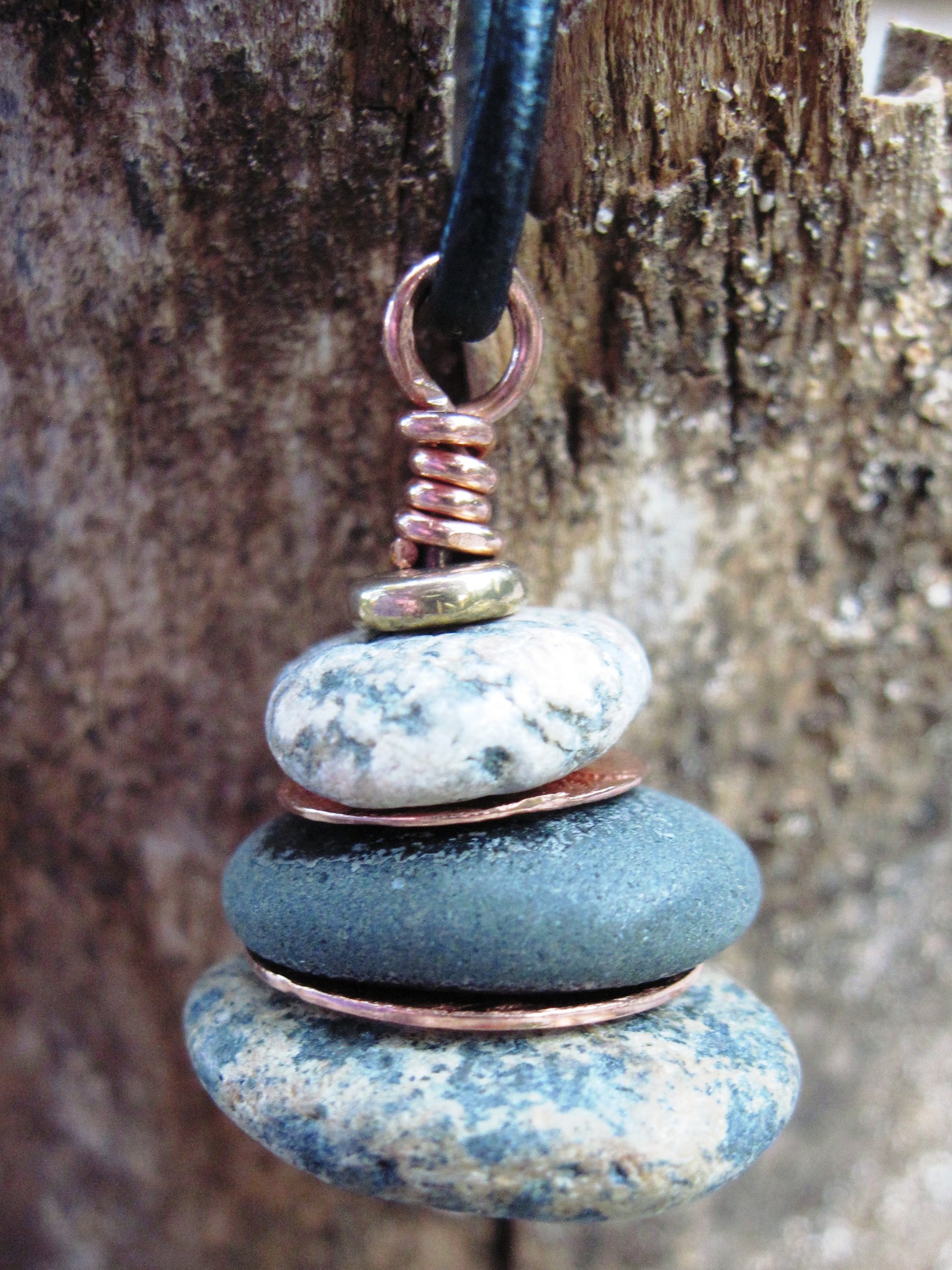 Om rock cairn made from three stones gathered on the Oregon beaches. The rocks are drilled the way they naturally stack and copper spacers from bench scraps accentuate the stones. A copper head pin holds the cairn together and a brass spacer is on the top and bottom of the cairn.