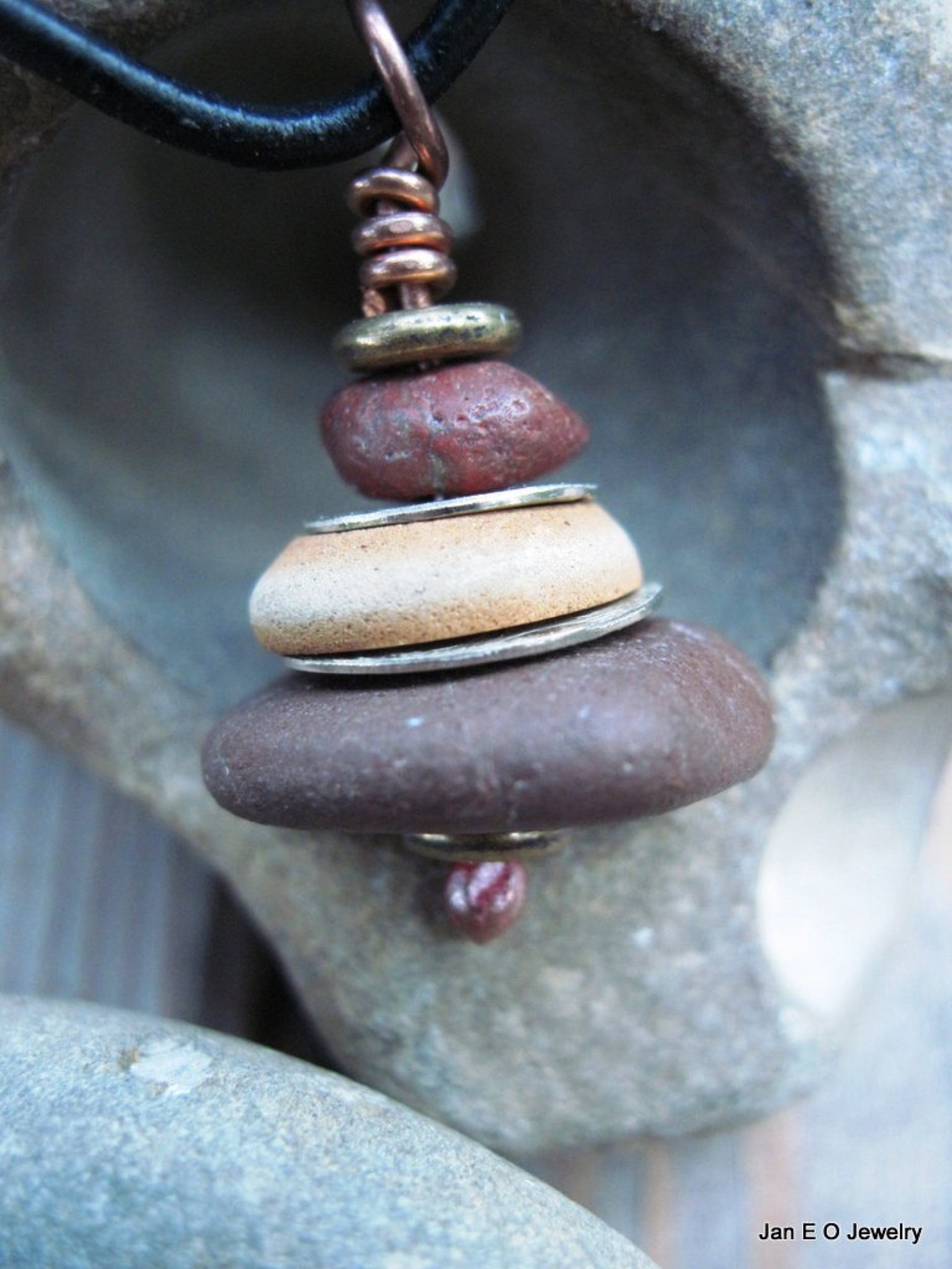 Beach rocks have been gathered stacked and drilled to make this stacked rock cairn. The rocks are drilled the way they naturally stack on my bench. German silver bench scraps have been cut into spacers between the stones. There is a brass spacer bead at the top and bottom of the cairn.