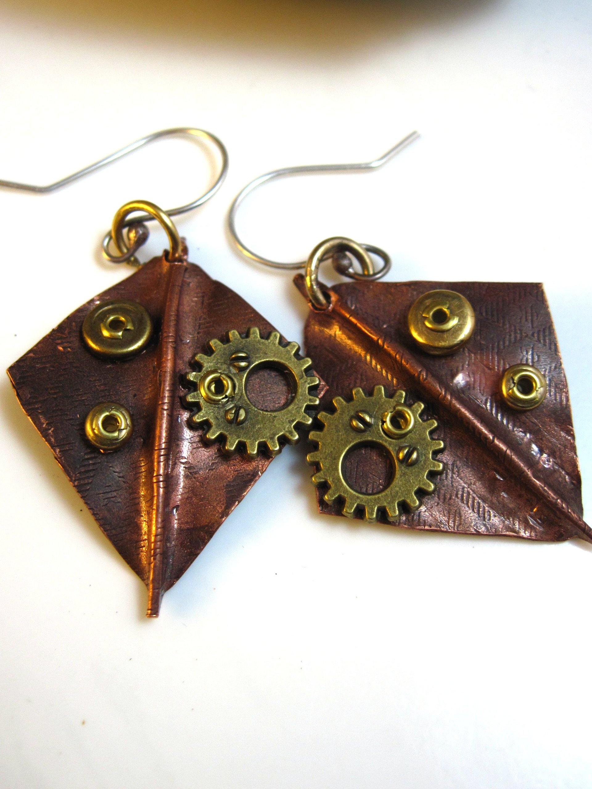 Recycled copper foldform steampunk large dangle diamond shape earring