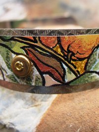 Fruit candy tin covered with grapes, leaves, apricots was repurposed to make a one of a kind mixed metal cuff. The tin is cold connected to German silver and adorned with spacers to act as a design element and also protect the tin. The cuff is about three quarters of an inch wide and the tin section is about a half inch wide. The inside length is just over 6 inches long.