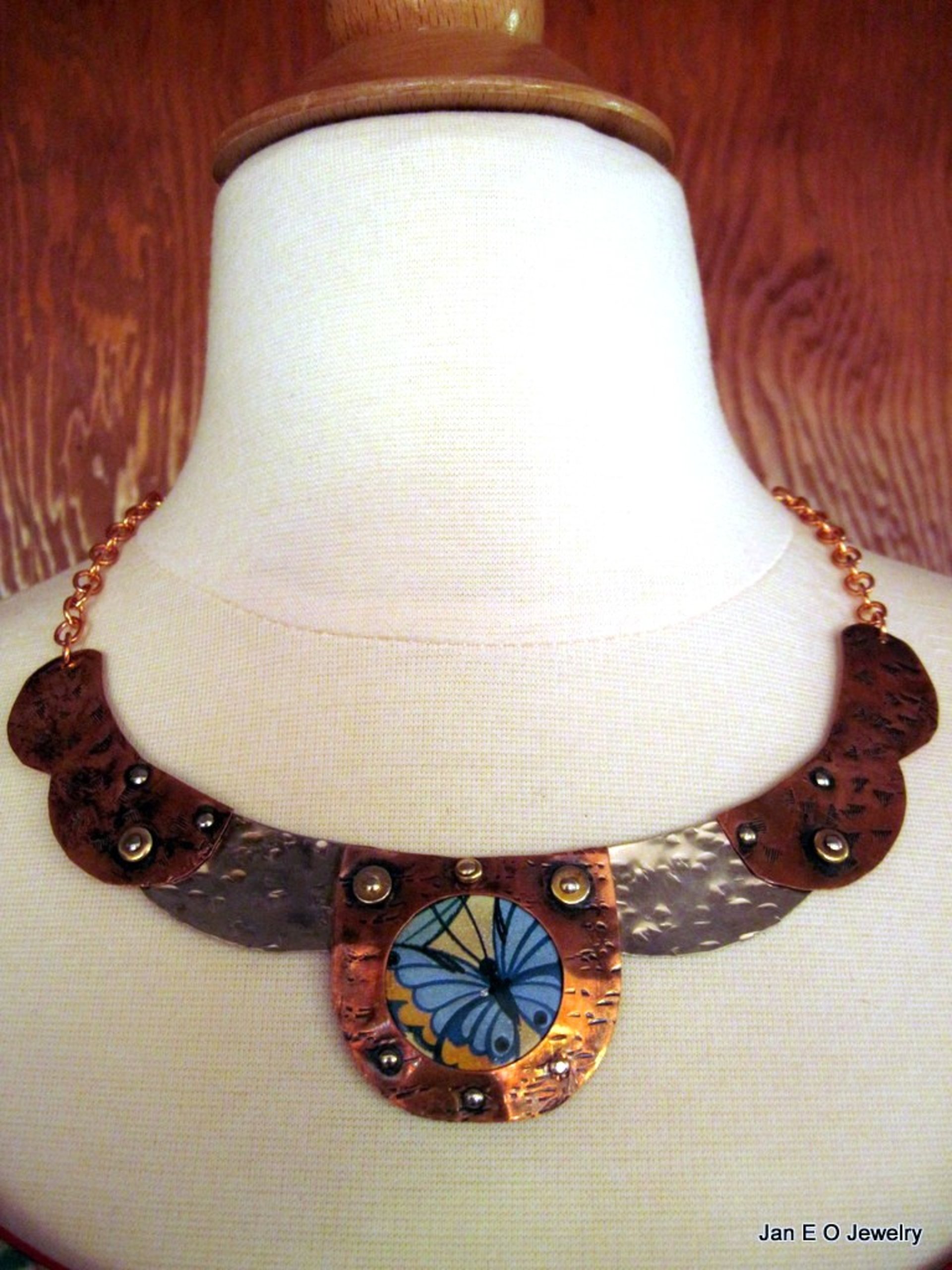 This pendant is a new look for the recycled tin line I call Trashy Tinsel. No landing in the trash for this tin instead it has been upcycled to make this neck collar. The metals in the collar are copper and German silver. The piece has been cold connected with rivets which add character to the design. A blue butterfly from a candy tin makes up the central piece of this necklace. The collar hangs from a bold copper chain which is finished with a two inch extension chain and a lobster clasp.