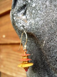 Tin recycled dangle earring with brass was inspired by an Asian lantern. The dangle is an inch long with the biggest tin being about the size of a dime. The brass beads and tin pieces hang on a copper head pin and hang from a sterling silver ear wire made by me. These earrings are similar to my "Jetson" earrings.