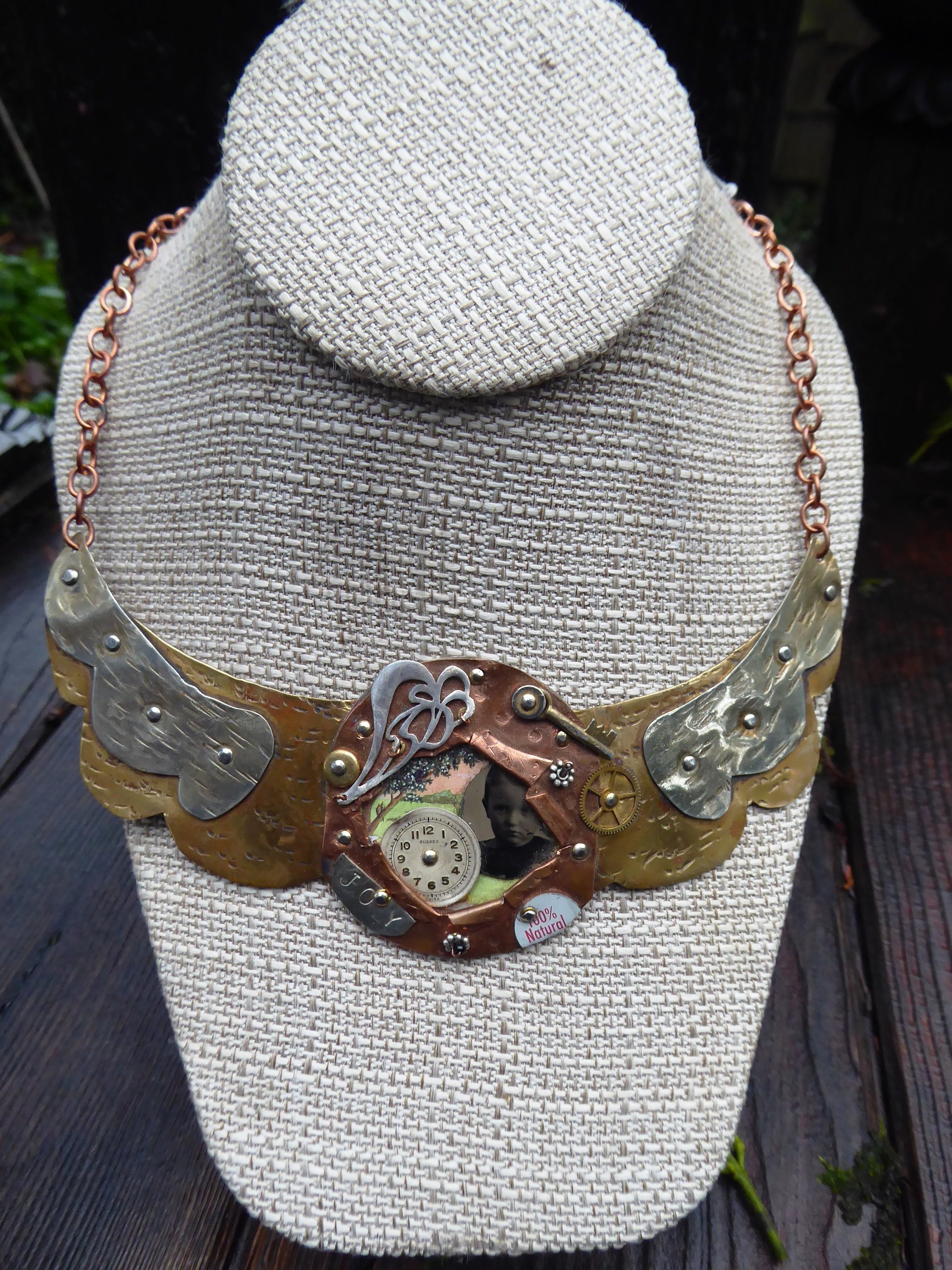 Copper, nugold, German silver and recycled vintage tin have been cold connected together to make this steampunk statement necklace. The vintage tea tin peaks out behind a tin type picture of a child and a clockface. Charms and recycled jewelry pieces have been cold connected to the front of the breastplate. There is a key charm, an old earring, a gear from a watch plus the word joy and 100percent natural. This pendant is about the joy of existence, the timeless nature of the now, the ability to be childlike.