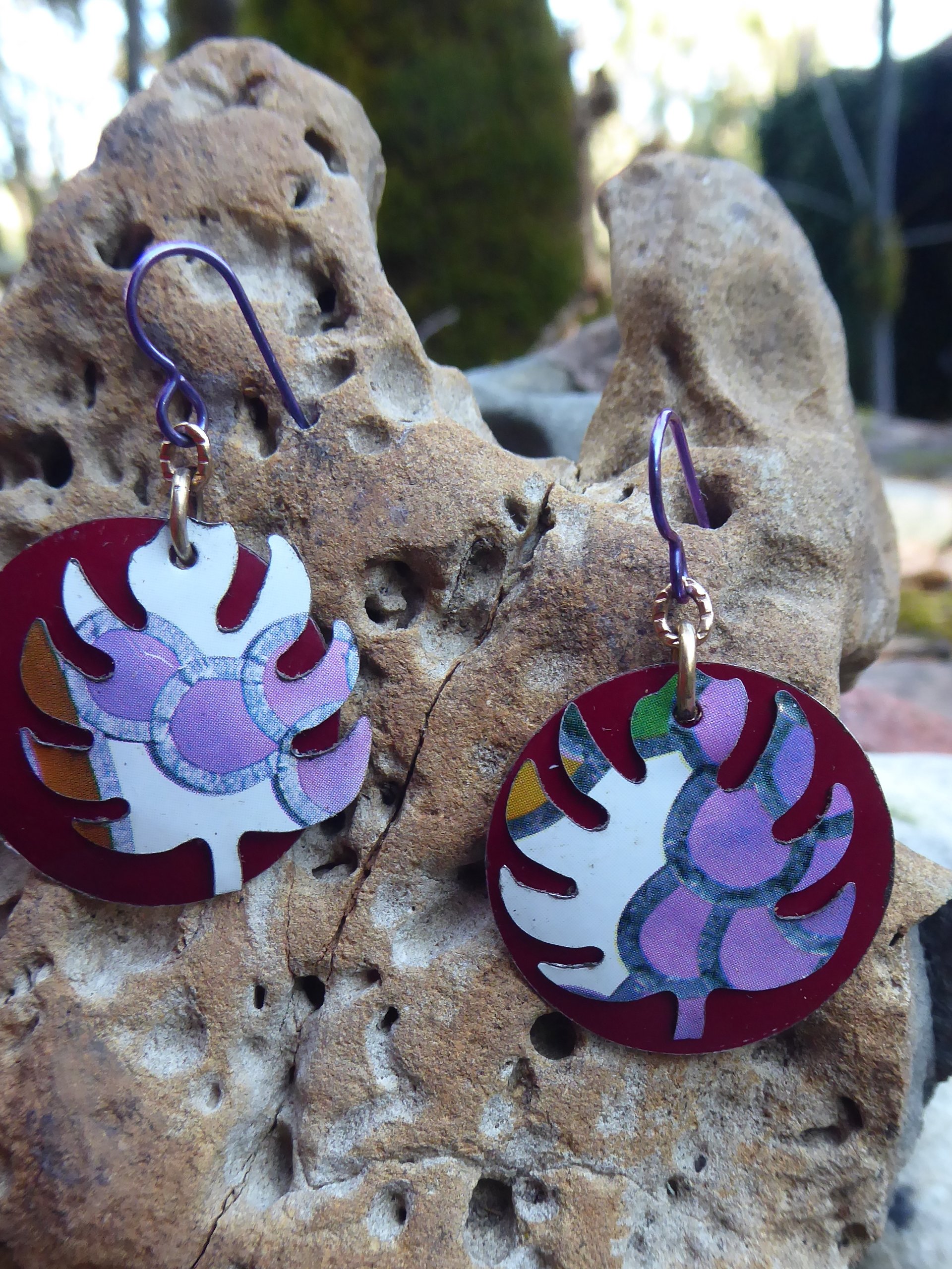 A fruit candy tin was cut into a leaf shape and hangs in front of a maroon circle. The leaf tin is white and purple. I love purple but finding purple tins is a challenge. The circular maroon tin is just over an inch in diameter. The leaf is slightly smaller. They are connected together with a jump ring.