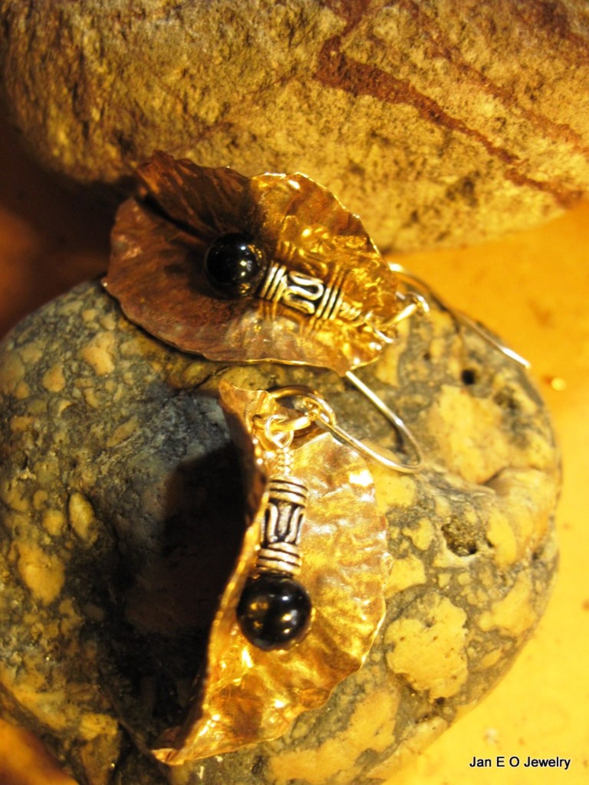 Tribal fold form bronze leaf earrings with sterling and black onyx