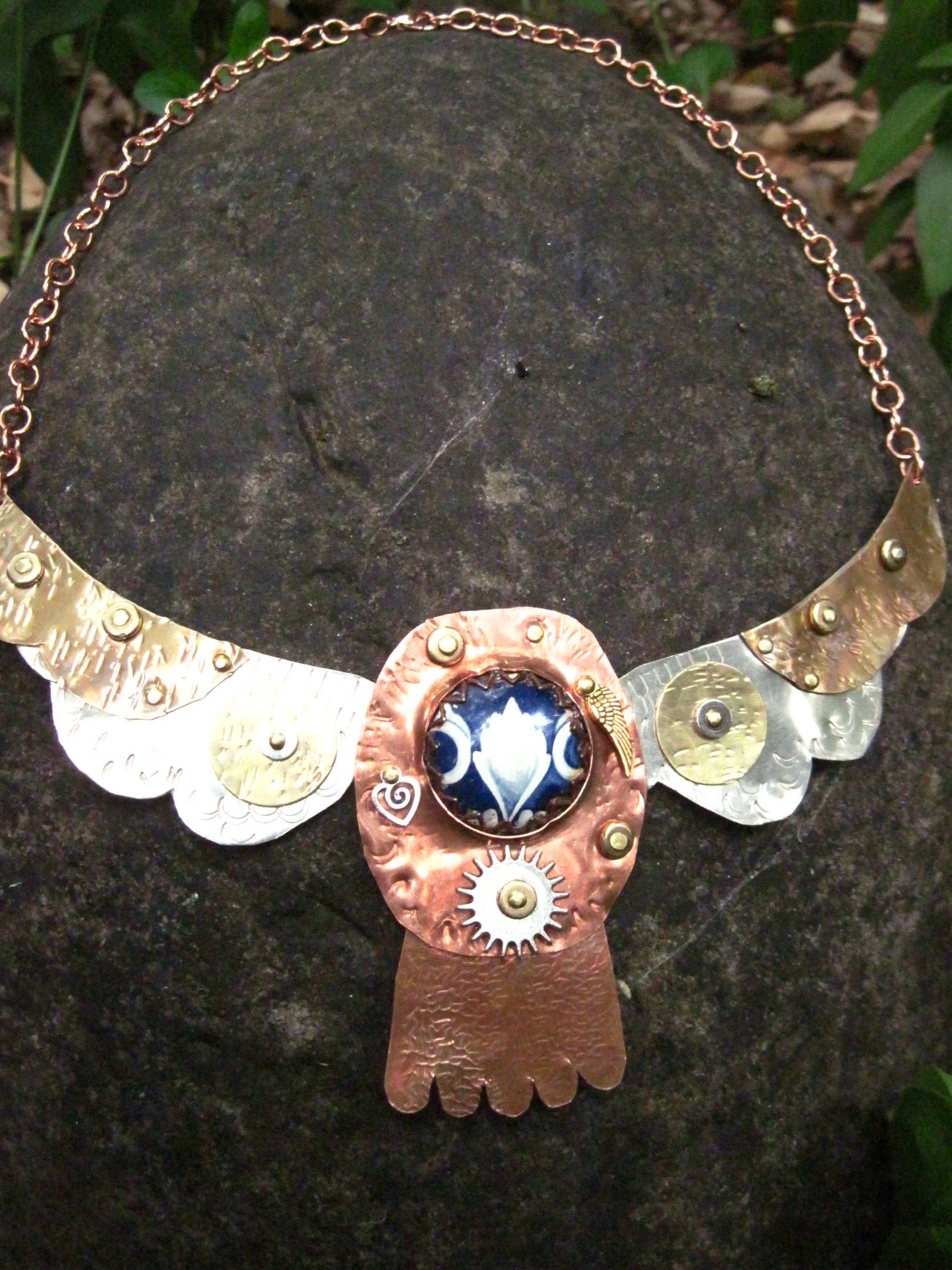 Love collaging and this statement pendant is like a collage of metals and materials. This bird in flight was inspired by a piece of vintage tin on my bench. The wings are brass and German silver. The center piece is that vintage tin surrounded by copper and charms. The tail is a piece of etched copper. This piece looks great on either sex. This Winged One is not for the timid because it is big and bold. This pendant is a little bit steampunk and a little bit tribal. I am thinking this piece is some sort of raptor maybe a hawk.